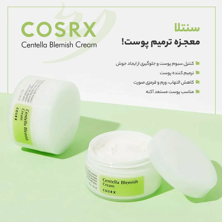 کرم ضد جوش سنتلا کوزارکس (COSRX Centella Blemish Cream) یک محصول مؤثر برای درمان جوشها و التهابات پوستی است که با استفاده از عصاره سنتلا آسیاتیکا، به کاهش قرمزی، التهابات و تسریع ترمیم پوست کمک میکند.